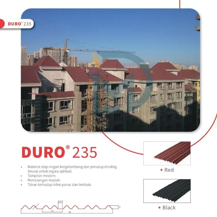 Atap bitumen Duro 235 adalah Material penutup atap bergelombang dan juga sebagai penutup dinding yang memiliki berat sangat ringan, tampilan modern dan tahan terhadap musim panas dan hujan.